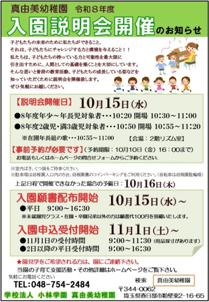 令和8年度 入園説明会・願書配布・受付 2025.10.11 子育て支援 行事・イベント admin 令和8年度入園2歳児・満3歳児、年少~年長児対象で、同日、時間別で開催します。 入園願書受付開始日の11月1日は同時に用品採寸があります。2日以降の受付は後日採寸を行います。 天候やその他の理由で延期となった場合は16日に行います。 予約制です。