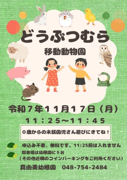 令和7年11月17日 未就園児イベント(どうぶつむら) 2025.11.06 子育て支援 行事・イベント admin 幼稚園の園庭に小動物や、羊など見たり触れたりできる動物がやってきます。 未就園児さんも11:25~45の時間内で参加できますのでぜひお越しください! 予約不要です。(雨天決行)